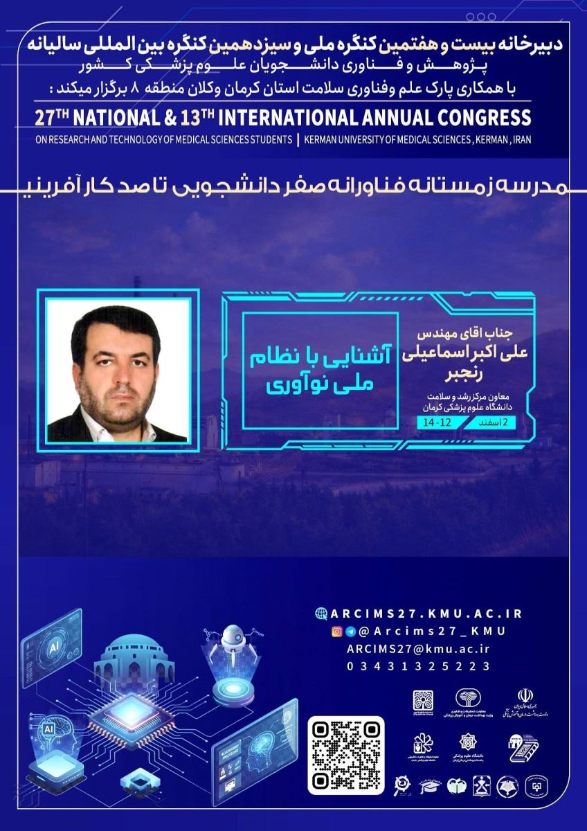 دبیرخانه ۲۷ـمین کنگره ملی و ۱۳ـمین کنگره بین المللی پژوهش و فناوری دانشجویان علوم پزشکی کشور با همکاری پارک علم و فناوری سلامت استان کرمان و کمیته های تحقیقات و فناوری دانشجویی کلان منطقه ۸ برگزار می کند